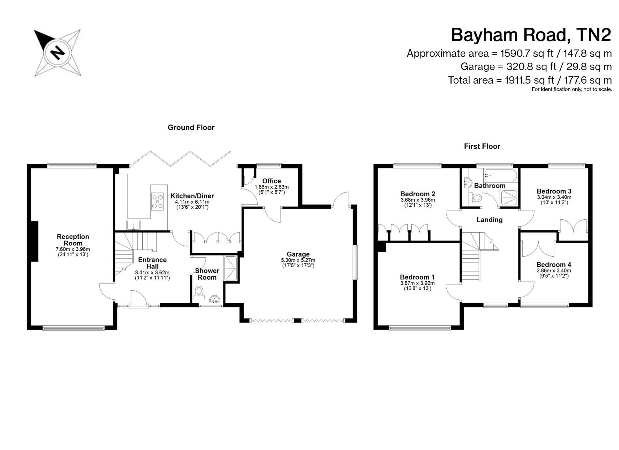 The first floor comprises four double bedrooms and a family bathroom with bath and separate shower. All bedrooms include fitted storage, and there is access to a boarded loft. The elevated position affords open views across the town from the rear bedrooms and landing.